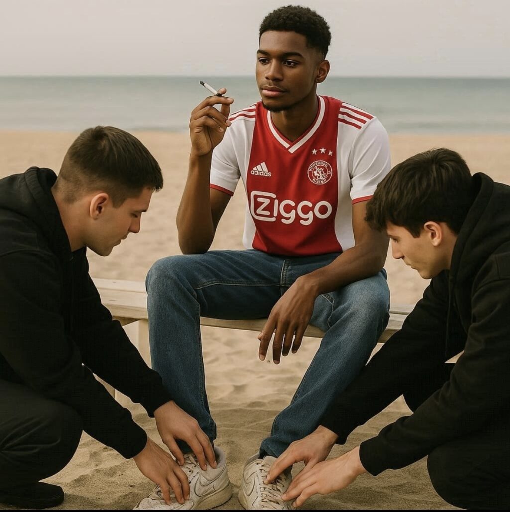 Wir nähern uns dem Boy auf der Bank. Jetzt sehe ich ihn besser. Er ist etwas jünger wie wir, so ca. 17-18 schlank, ca. 1,80 m groß, tiefschwarze Haut, kurze schwarze Haare und blendend weiße Zähne. Um den Hals hat er eine dicke goldene Kette und einen Brillantohring im Ohr. Er trägt ein Trikot von Ajax Amsterdam, schwarze Nike Trainingshose, weiße Socken und weiße Nike Air Sneaker mit blauem Nike Logo. Wobei „Weiß“ bei den Schuhen nicht stimmt, sie sind ziemlich fertig und es sieht aus, als hätten sie besonders vorne und an den Seiten Grünspan angesetzt. Der Boy sitzt entspannt auf der Bank, schaut aufs Meer und raucht eine Zigarette.